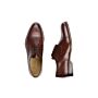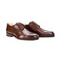 Este zapato está fabricado con una construcción Blake y becerro boxcalf francés con acabado de anilina de las curtidurías de Annonay con una pátina a mano sobre una suela de cuero con patín de caucho y con vira de piel. Ojales invisibles y cordones redondos encerados de algodón tono sobre tono.