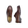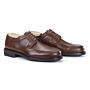 Este derby de hombre está fabricado con una construcción Blake y becerro boxcalf francés patinada sobre suela de goma, con vira de piel. Ojales invisibles y cordones redondos encerados de algodón tono sobre tono.