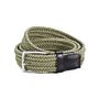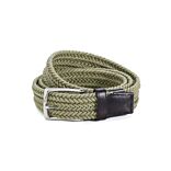 Cinturón fino de algodón trenzado, con cierre de hebilla cuadrada de latón macizo niquelado,con base de hebilla, punta y lazo de cuero color chocolate.