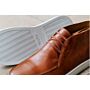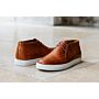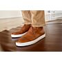 Esta zapatilla está confeccionada con cosido lateral y piel de vacuno patinada a mano, sobre una suela gruesa y cómoda de caucho. Refuerzo trasero en piel.