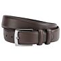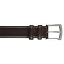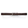 Cinturón de cuero liso o de terciopelo, forro de cuero, con cierre de hebilla cuadrada ligeramente arqueada de latón macizo niquelado, con dos trabillas de cuero.