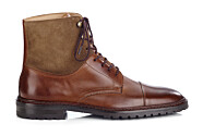 On rubber lug outsole with hand finished cow leather and water-repellent cow suede leather. Tone on tone round waxed cotton laces guided by invisible eyelets and three brass hooks.