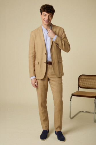 The linen suit is an elegant yet naturally relaxed summer suit, ideal for a refined look when temperatures rise. Carefully crafted from 100% European linen twill with a washed finish, it offers a soft drape and optimal comfort. A breathable and thermoregulating fiber par excellence, linen brings freshness and lightness throughout the day. A noble fabric that becomes softer with every wash and wear, for a suit that is as comfortable as it is refined during the summer season.
