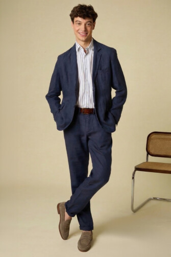 The linen suit is an elegant yet naturally relaxed summer suit, ideal for a refined look when temperatures rise. Carefully crafted from 100% European linen twill with a washed finish, it offers a soft drape and optimal comfort. A breathable and thermoregulating fiber par excellence, linen brings freshness and lightness throughout the day. A noble fabric that becomes softer with every wash and wear, for a suit that is as comfortable as it is refined during the summer season.