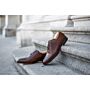 Blake welted with aniline boxcalf with patine from Tanneries d’Annonay on a leather outsole with rubber pad, with welt. Absolutely perfect with dressy trousers or chinos.