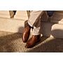 Available in boxcalf leather with hand patine on leather outsole with integrated rubber pad, with leather welt.